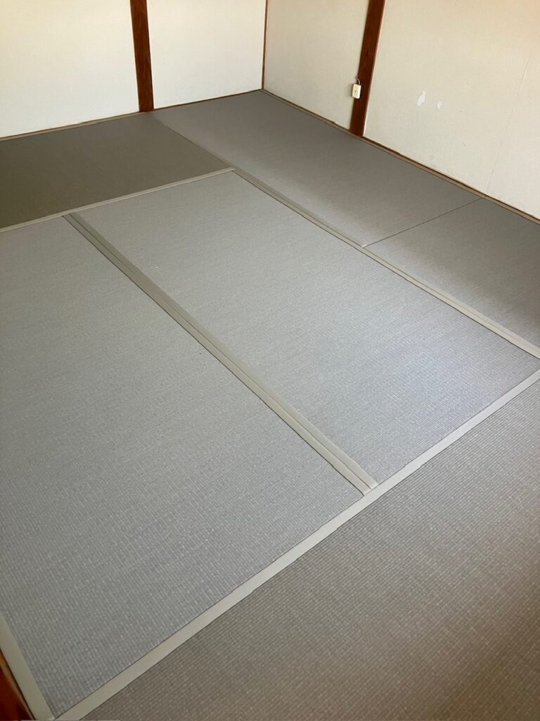 ダイケン畳の清流シリーズで縁なしタイプの表替えをご依頼いただきました。亜麻色と白茶色の組み合わせが、とっても素敵です。